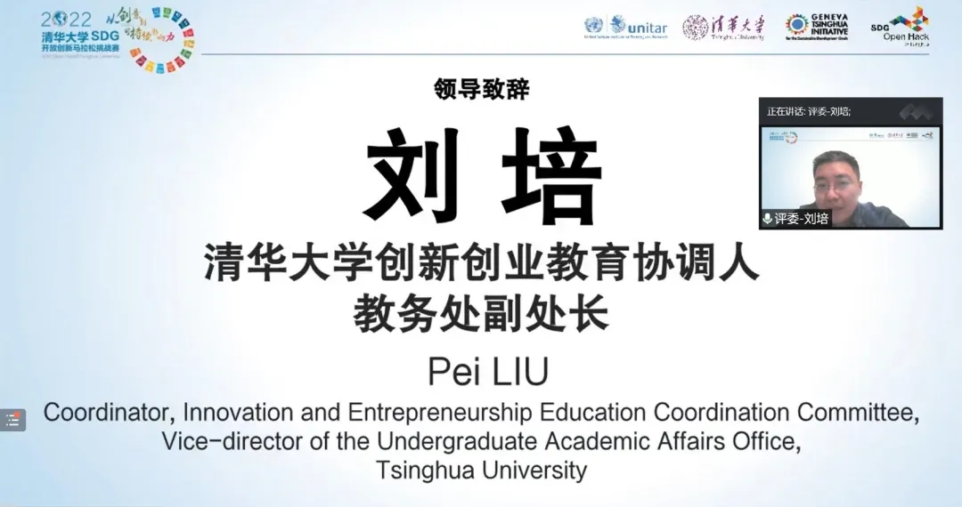 清华大学创新创业教育协调人、教务处副处长刘培在开场致辞中谈到,在高校开展创新创业工作的核心是教育。开展创新创业教育首先是以价值导向为引领,SDG大赛所倡导的可持续发展理念就是很好的例子。好的创新创业教育的核心是提供优质高效的创新创业教学资源,SDG大赛以课赛结合的形式,整合优质校内外教学资源,为同学们提供了深度接触、了解、参与创新创业活动的机会。