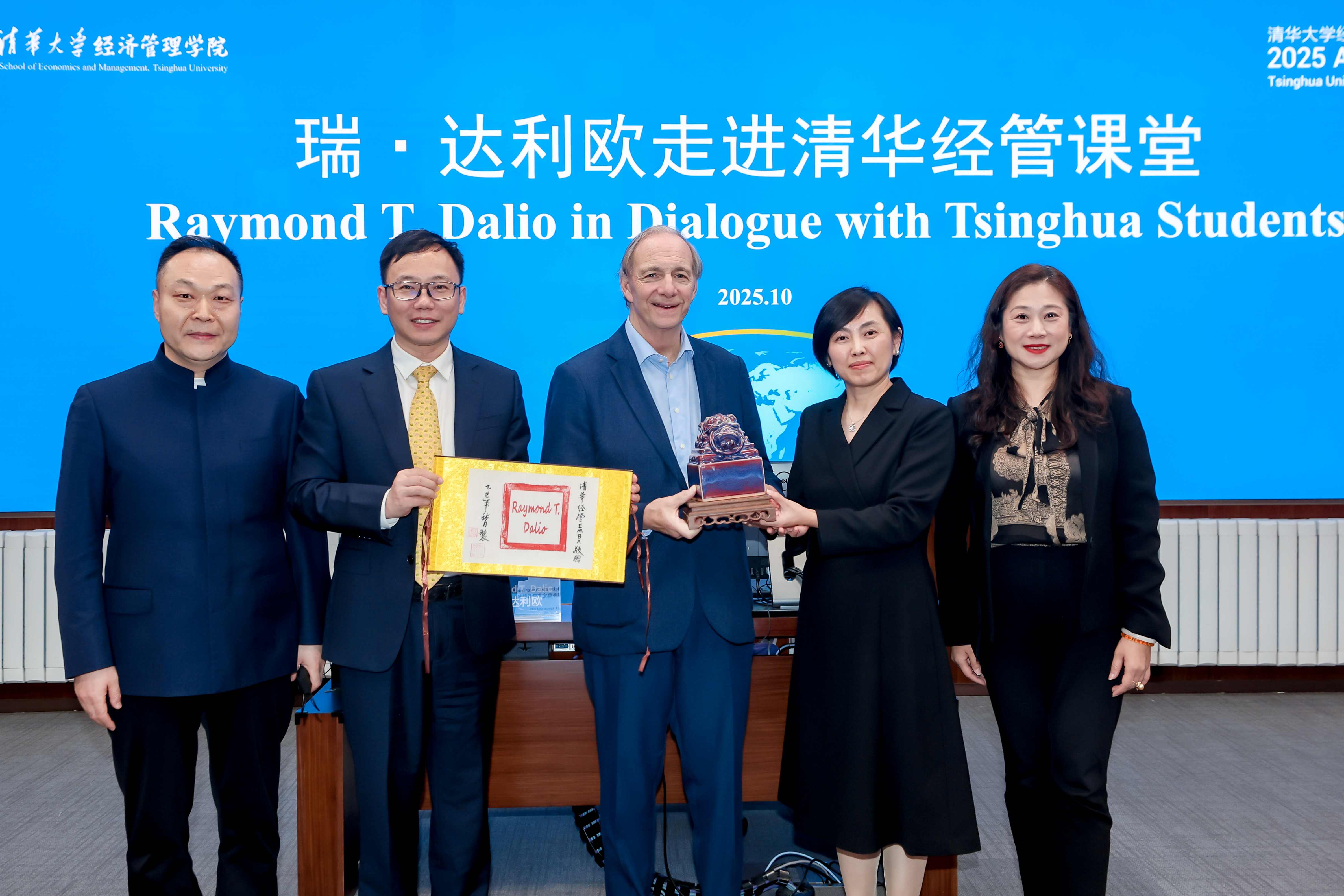最后,薛健、何平、庄丽、清华经管EMBA2012级校友李海峰向瑞·达利欧赠送了纪念品。