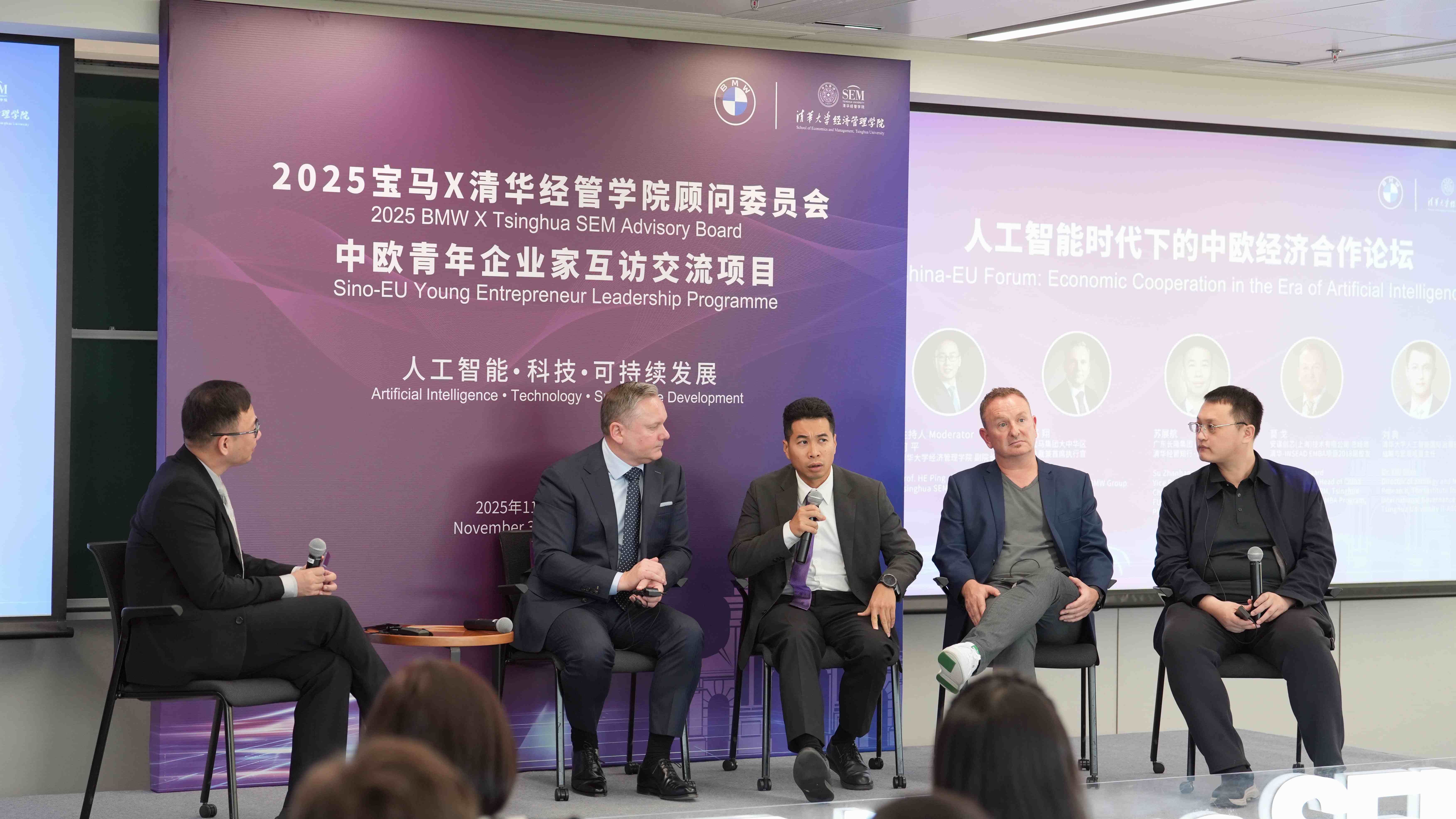 圆桌论坛环节,何平、高翔,以及清华大学人工智能国际治理研究院战略与宏观项目主任刘典,清华经管EMBA2020级校友、清华经管知行·未来科技首期班校友、广东长隆集团有限公司副总裁苏展航,清华经管TIEMBA2018届校友、安谋创芯(上海)技术有限公司总经理莫戈,共同围绕“人工智能时代下的中欧经济合作”以及中德在智能驾驶领域的技术融合与安全标准共建、文旅场景AI创新应用中的中欧合作、开源趋势与基础研究对AI的前沿推动等展开讨论。