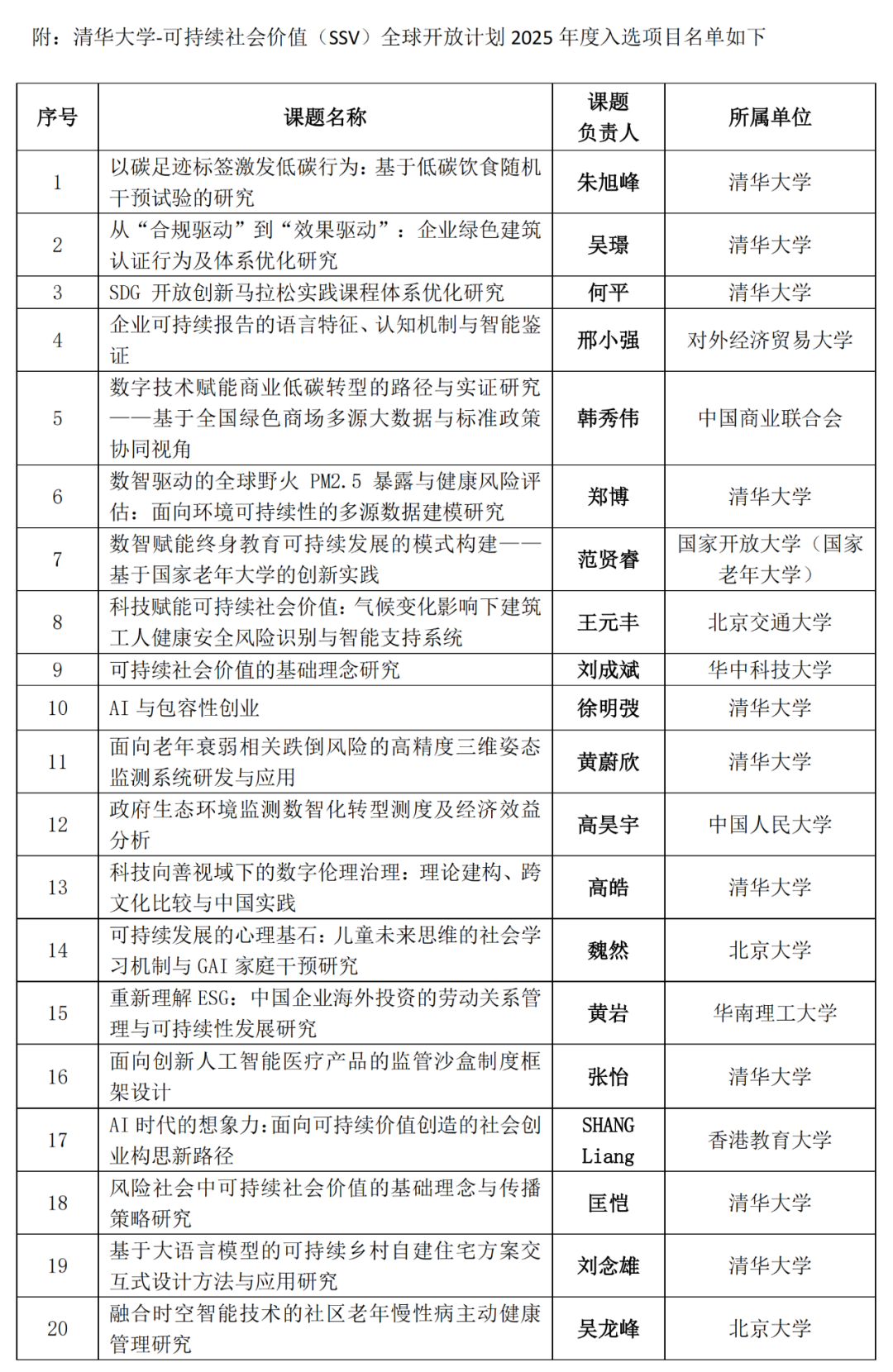 “SSV开放计划”聚焦“可持续社会价值”这一核心理念,设立可持续社会价值的基础理念、企业社会价值实践、科技向善与数字伦理、人工智能在普惠社会中的应用、数字技术赋能可持续经济增长、智能技术与环境可持续性、智能技术促进教育公平与终身学习、数字健康与智能医疗、文化传承与科技创新的可持续融合发展、智能城市建设与可持续发展模式,以及全球数字合作与跨境治理等11项议题。今年共有20项面向深刻社会挑战的研究课题入选,围绕气候行动、数字伦理、健康福祉、教育公平、企业责任、城乡可持续等关键方向展开,呈现出跨学科协作与面向未来的研究格局。SSV开放计划不仅为研究提供资助,也致力于构建一个面向未来的可持续社会价值生态系统——连接学者、政策制定者、企业与社会组织;推动研究成果转化为可执行的政策建议、工具包与实践模型。预计2025年度入选项目将在未来1~3年产出高质量的学术论文、政策报告与社会实践成果,为全球可持续发展贡献新的思想、路径与方法。