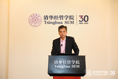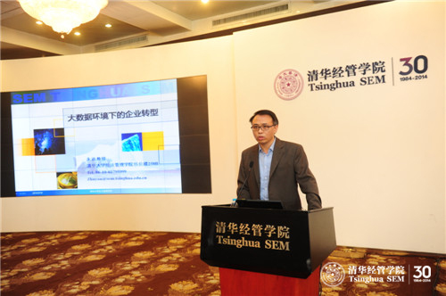 30周年院庆的情况,管理科学与工程系系主任、联想讲席教授陈剑致欢迎辞。本次活动在信息领域资深专家陈国青教授关于“大数据的管理喻意与研究展望”的主题演讲中正式开始,陈教授从信息技术沿革引出大数据的基本特征,指出大数据的超规模、多样性、低价值密度、实时性四方面特征,带来了“IT融合”、“内外部融合”、“价值融合”等三大融合;随着信息产品(如软件、IT服务等)及其应用(如虚拟体验、个性推荐、社会网络、网络搜索等),技术创新呈现出越来越丰富的形态和特征,催生出“新模式”(如线上线下互动的O2O(online-to-offline或offline-to-online)运作模式)、“新业态”(如众包(crowdsourcing)生产和创新组织)、“新人群”(如生活在赛博空间中的人群及其行为和需求)等,并对相关研究进行展望,指出未来学术界与业界将围绕“社会化的价值创造”、“网络化的企业运作”和“实时化的市场洞察”三方面展开。