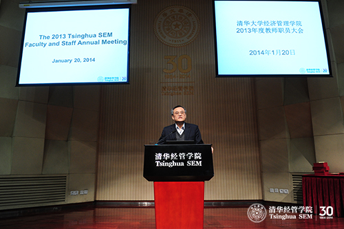 大会首先由钱颖一院长作“院情报告”。他以视频、叙述、数字三种形式,带领大家回顾了共同奋斗的2013年。视频短片分为“重大活动”、“创新”、“殊荣”、“师者”、“学子”、“全球战略”、“校友”、“30周年院庆活动”八个部分,展示了过去一年成人自拍视频